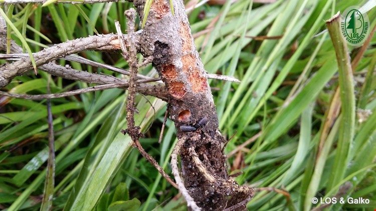Krasoň, ktorý napáda oslabené borovice na suchých a oslnených lokalitách. Obsadzuje najmä spodnú časť kmeňa.
