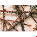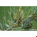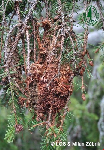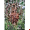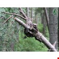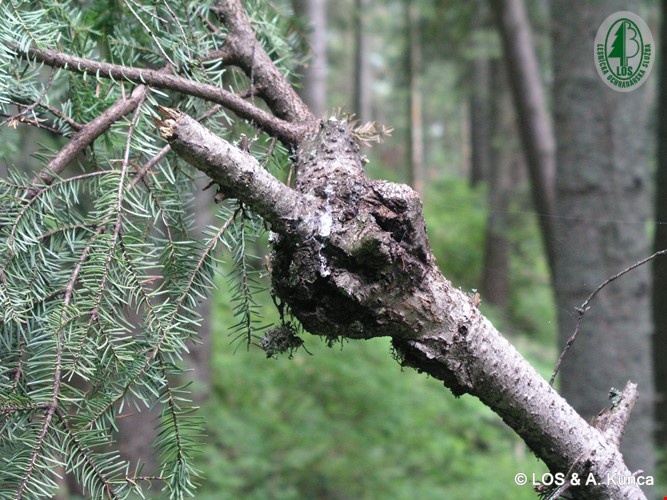 Rakovinové hrče na kmeni a vetvách. Okrem toho sa hrdza vyváíja aj na ihliciach čarovníkov vytvorenýc na vetvách.