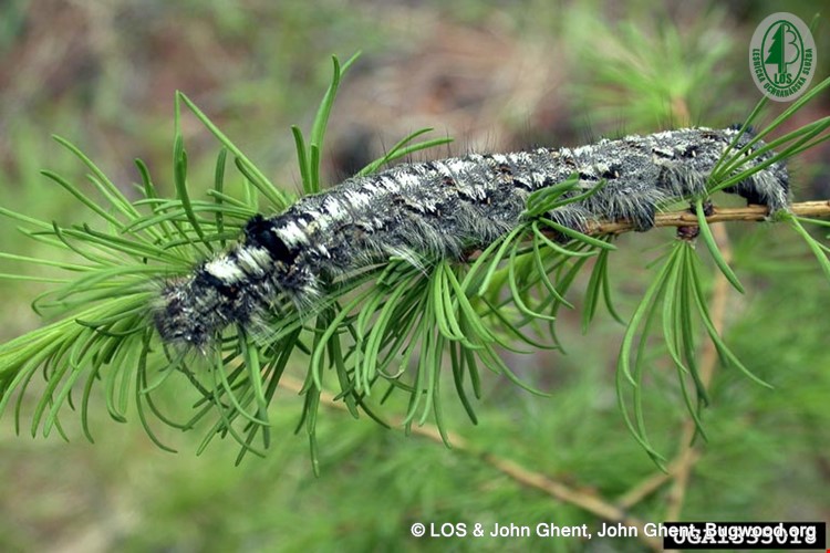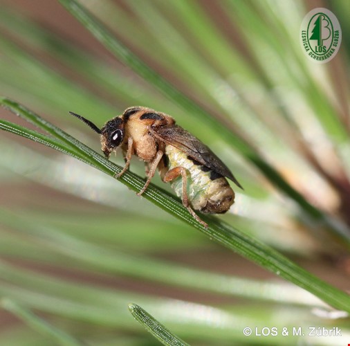 Osička z čeľade Diprionidae. Zelenosivé pahúsenice na vetvách.