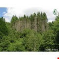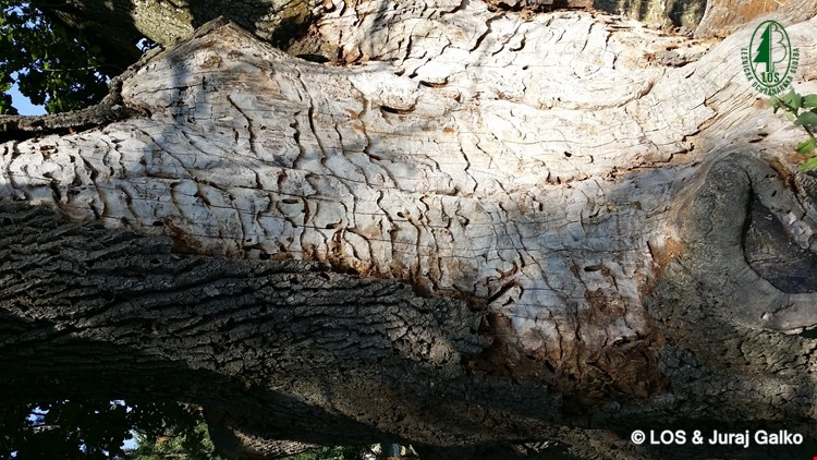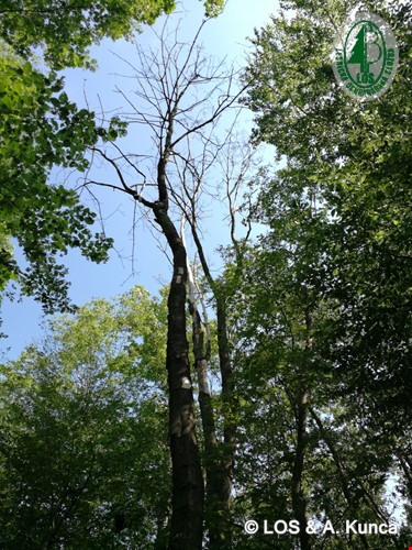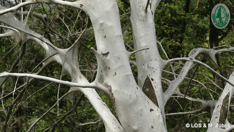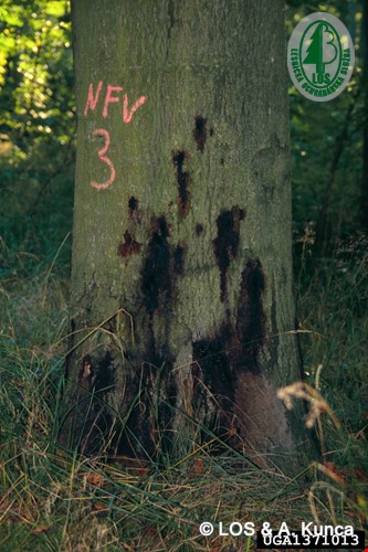 Dechtovité škvrny na báze kmeňa bukov, žltnutie listov a odumieranie vetiev v korune.