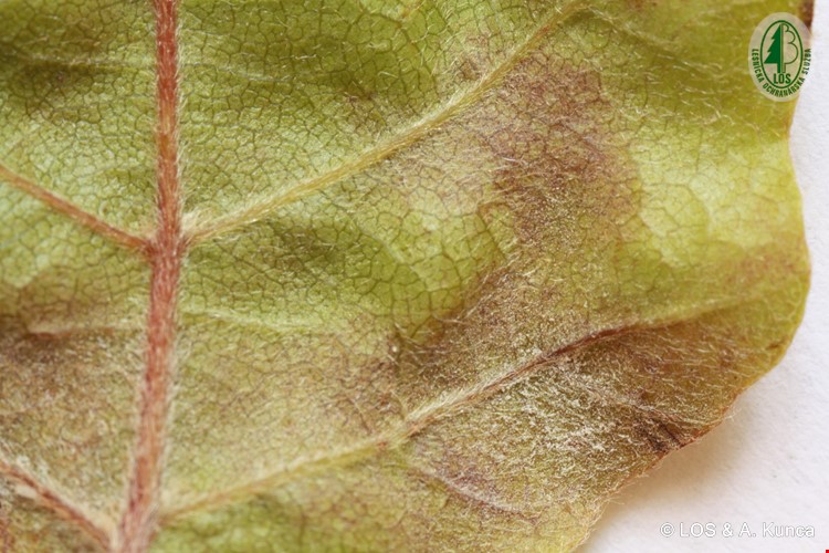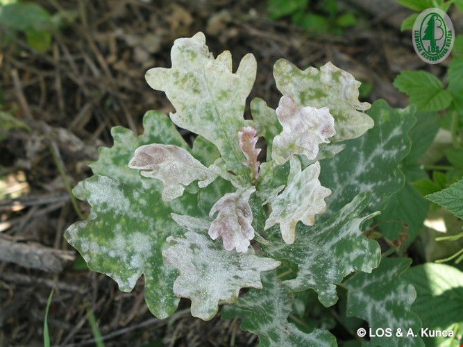 Biele múčnaté poprašky na listoch dubov, neskôr sú tieto biele poprašky aj na najmä jánskych výhonkoch. Listy predčasne hnednú a opadávajú, výhonky oneskorene vyzrievajú a sú náchylné na poškodenie skorými mrazmi v októbri.