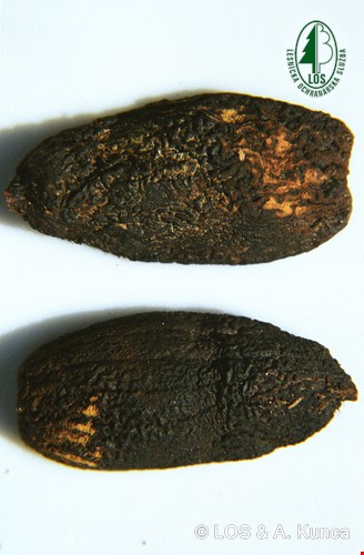 Na kôre sú viditeľné čierne hrbolčeky plodníc, v lete aj pohárikovité plodnice, ktoré sú viditeľné najmä za mokra. Determinácia mikroskopicky.