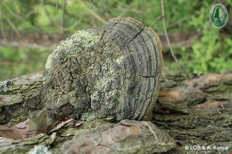 Parazitická trvalá plodnica tmavohnedý povrch, škoricovo hnedé hyméniu. Spôsobuje rozsiahlu hnilobu živých borovíc, ale aj iných ihličnanov.