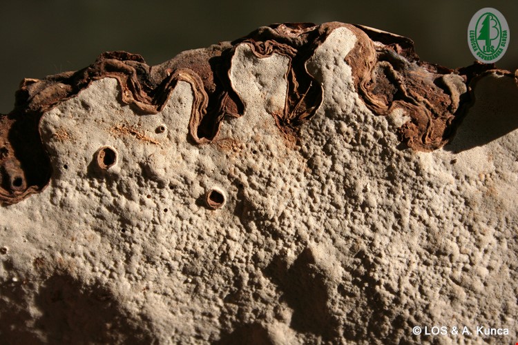 Drevokazná huba s plodnicami nepravidelného tvaru, bokom prirastené, polo rozliate.
