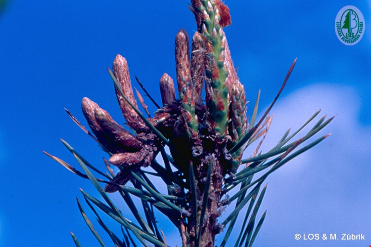 Odumieranie tohoročných výhonkov a to ešte v čase, ked ihlice nemusia byť úplne vyvinuté a tak tie hnedé ihlice na konci výhonkov sú skrátené. Takéto vetvy vyzerajú ako maliarske štetce alebo kefy.