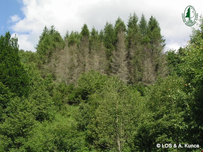 Spôsobuje vädnutie, žltnutie a v konečnej fáze odumieranie najmä ihličnatých drevín.