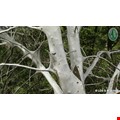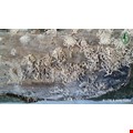 Prítomnosť malých bielych plodníc na odumretom dreve.