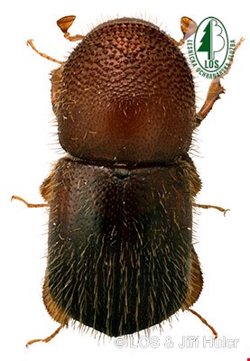 Čiernohnedý lesklý chrobák dlhý 2,8-4,5 mm, v zadnej časti kroviek má 4 páry zúbkov. Pôvodne rozšírený v Severnej Európe a Ázii.