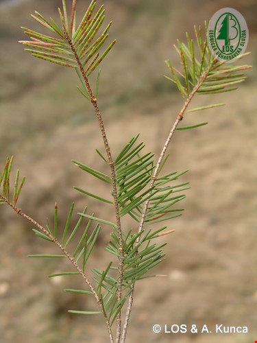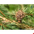 Rakovinové hrče na kmeni a vetvách. Okrem toho sa hrdza vyváíja aj na ihliciach čarovníkov vytvorenýc na vetvách.