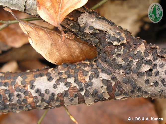 Na kôre sú viditeľné čierne hrbolčeky plodníc, v lete aj pohárikovité plodnice, ktoré sú viditeľné najmä za mokra. Determinácia mikroskopicky.