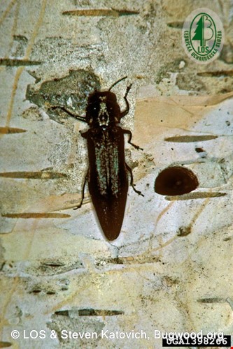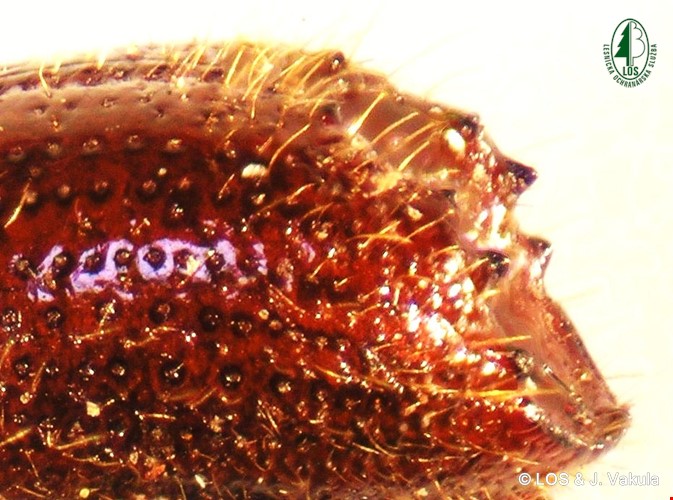 Čiernohnedý lesklý chrobák dlhý 2,8-4,5 mm, v zadnej časti kroviek má 4 páry zúbkov. Pôvodne rozšírený v Severnej Európe a Ázii.