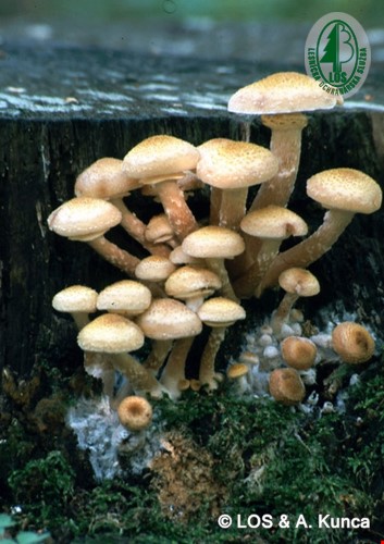 Srócium a rizomorfy pod kôrou koreňov a kmeňa, plodnice v jeseni na koreňových nábehoch a kmeni