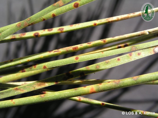 Typickým prejavom je hrdzavenie a následné odumieranie ihlíc v spodnej časti koruny, na ihliciach sú prítomné v rôznej intenzite červené pruhy a v nich plodnice anamorfného štádia. Červené sfarbenie spôsobuje prítomný dothistromin a najvýraznejšie pôsobí v jarnom období, keď sú tieto príznaky najčitateľnejšie. Postihnuté sú najstaršie ihlice a pri silnej infekcii sa môžu tvoriť tzv. "Levie chvosty", kedy zelené sú iba rašiace ihlice na skrátenom výhonku a staršie sú odumreté a červenohnedo sfarbené. Intenzita opadávanie ihlíc je u jednotlivých hostiteľov veľmi premenlivá. Napríklad borovica čierna, kosodrevina, borovica ťažká drží napadnuté ihlice dlho na výhonku, naopak borovica lesná opadáva okamžite po zhnednutí a nájsť u nej na strome ihlice s plodnicami je ťažké.