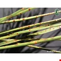 tvorba drobných čiernych kôpok (pikníd) ma spodnej strane zelených ihlic