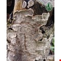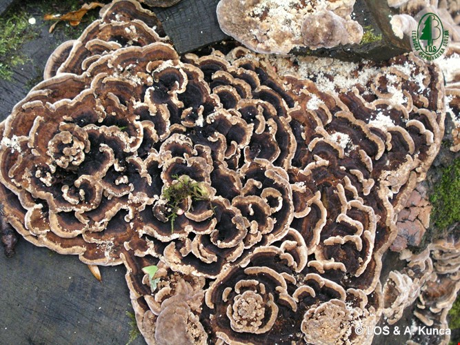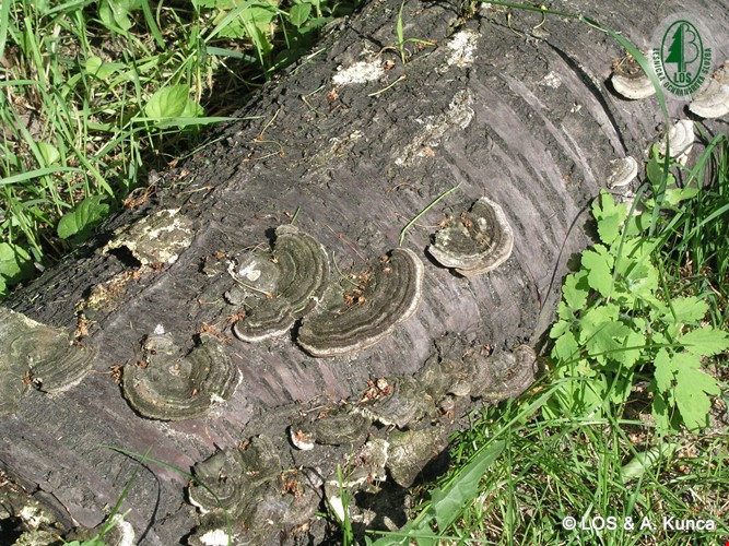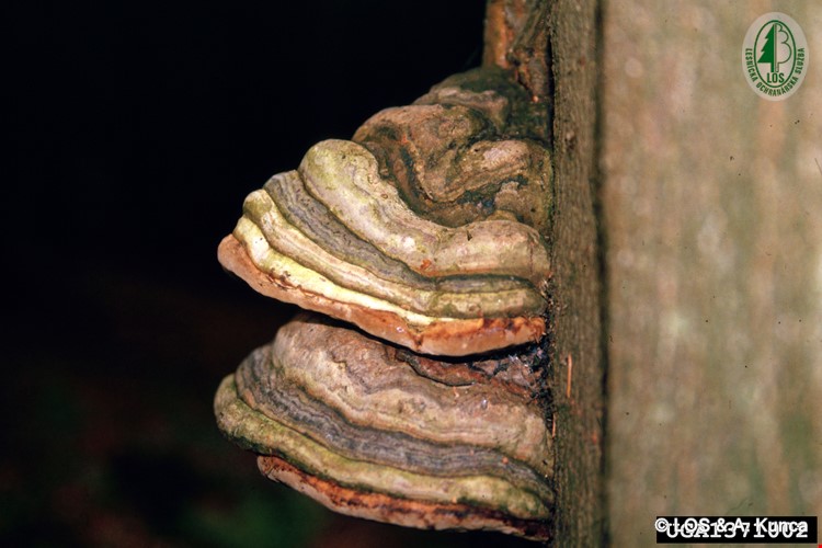 Na kmeni stromov prítomnosť polkruhových brázdovito pásikavých chlpatých plodníc o veľkosti 4 až 12 centimetrov.