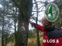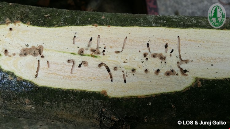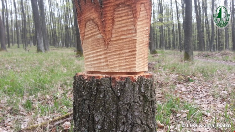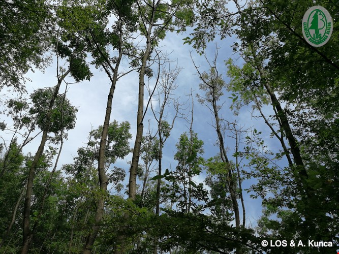 Dechtovité škvrny na báze kmeňa bukov, žltnutie listov a odumieranie vetiev v korune.