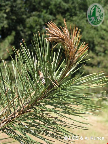 Odumieranie tohoročných výhonkov a to ešte v čase, ked ihlice nemusia byť úplne vyvinuté a tak tie hnedé ihlice na konci výhonkov sú skrátené. Takéto vetvy vyzerajú ako maliarske štetce alebo kefy.