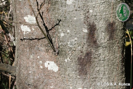Dechtovité škvrny na kmeni a defoliácia koruny.