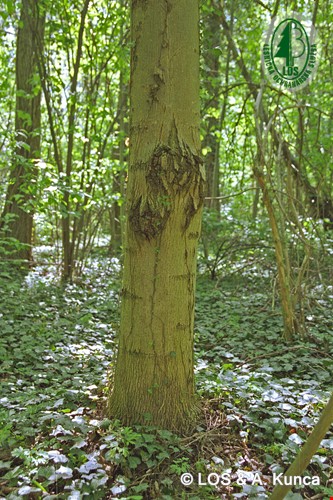 Nekróza kôry a rakovinové zhrubnutie vetiev.
