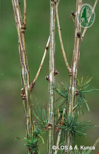 Rakovinové hrče na kmeni a vetvách. Okrem toho sa hrdza vyváíja aj na ihliciach čarovníkov vytvorenýc na vetvách.