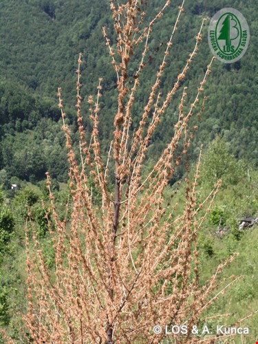 Nekrózy kôry kmeňa v terminálnej časti a vetiev (kým nie je na kmeni borka).