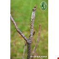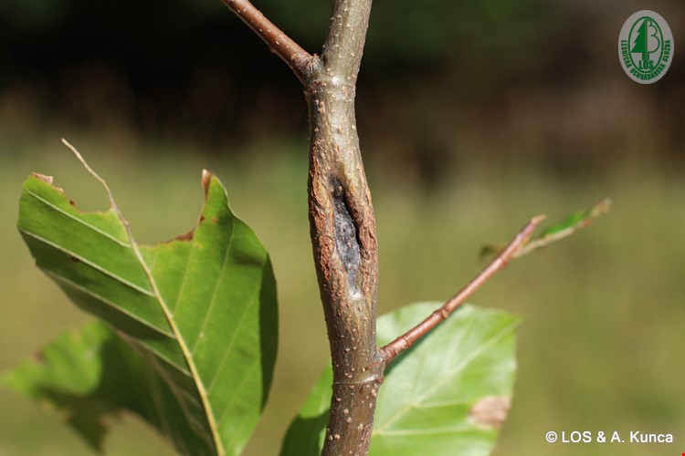 Nekrózy kôry v oválnom tvare so stredom v mieste pripojenia vetvičky.