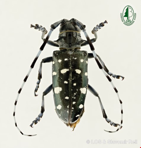 Imága sú veľké 2 - 3 cm s bielymi škvrnami na čiernych krovkách a párom dlhých tykadiel. Príznakom poškodenia môže byť hrubá drvina pripomínajúca piliny, dutá kôra v mieste žeru mladých lariev alebo výletové otvory o priemere 6 - 14 mm. Na napadnutých stromoch dochádza k odumieraniu a lámaniu konárov.